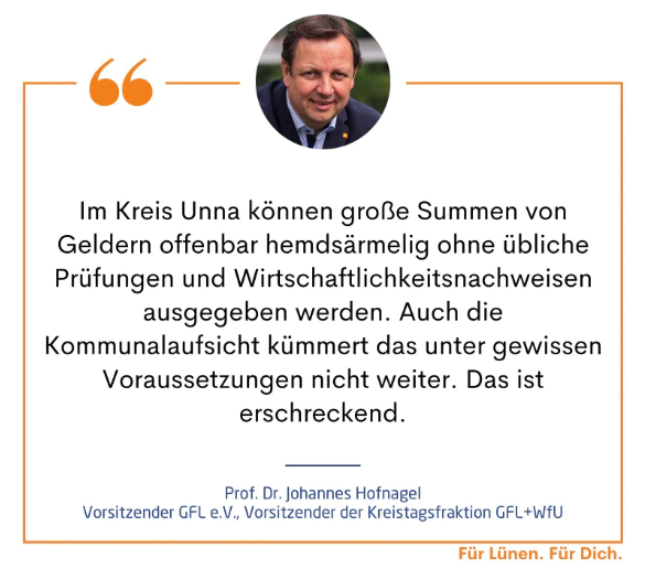 „Man fasst sich an den Kopf und fragt sich, wie im Kreis Unna mit Millionensummen umgegangen werden kann. Die aufgeblähte Kreis-Holding wird unter Nichtbeachtung von üblichen Wirtschaftlichkeitsgrundsätzen aus der Taufe gehoben – einfach auf der Basis von mündlich vorgetragenen Informationen und Annahmen sowie ohne üblichen Wirtschaftsplan und ohne Betrachtung von kostengünstigeren Handlungsmöglichkeiten. Für die Fraktion der Wählergemeinschaften GFL (Gemeinsam Für Lünen) und WfU (Wir für Unna) bleibt der Fall weiter ein Finanzskandal und verschlimmert sich sogar noch durch die Stellungnahme der Kommunalaufsicht.“