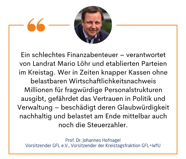 „Das Prüfungsergebnis ist insbesondere ein vernichtendes Urteil für Landrat Mario Löhr und die etablierten großen Parteien im Kreistag, die den Beschlüssen zugestimmt haben – aber auch für die Bezirksregierung in Arnsberg, die eine Beanstandung der politischen Beschlüsse im Kreistag abgelehnt hatte“, kommentiert GFL+WfU-Fraktionsvorsitzender Johannes Hofnagel das Prüfungsergebnis aus Düsseldorf.